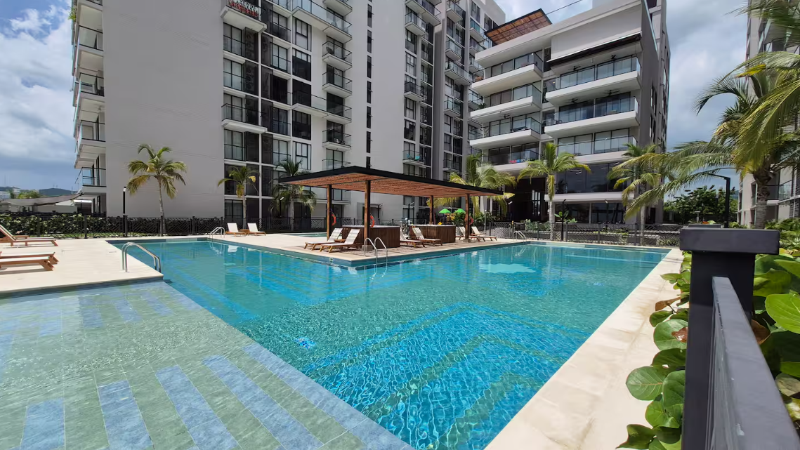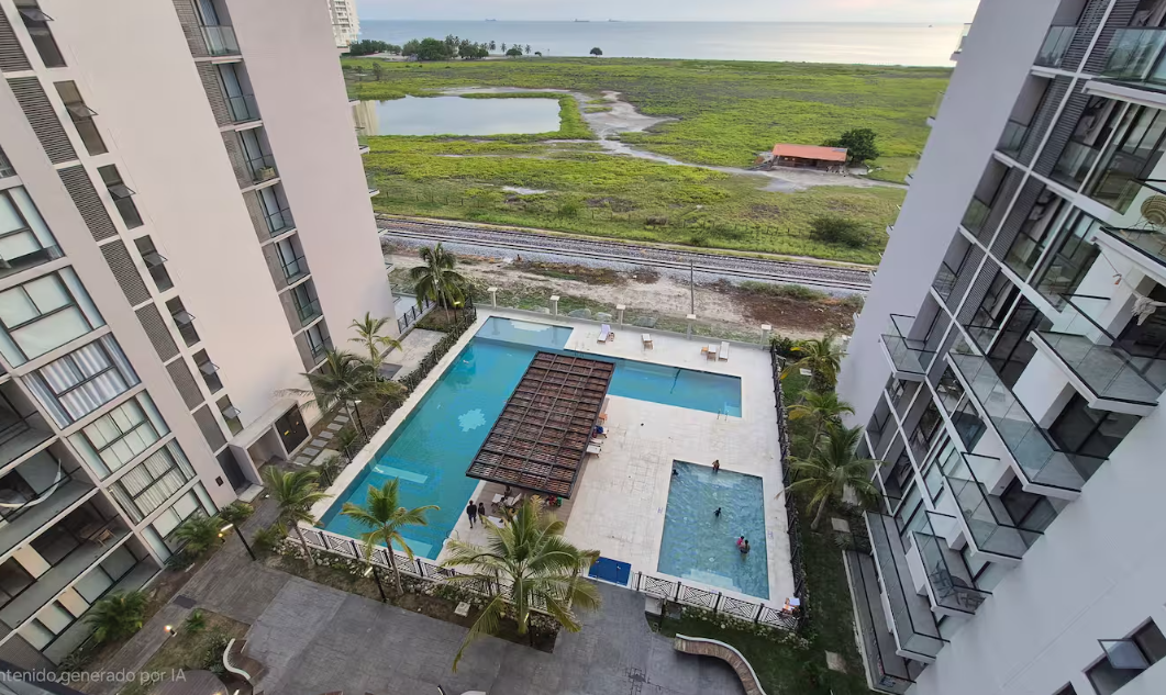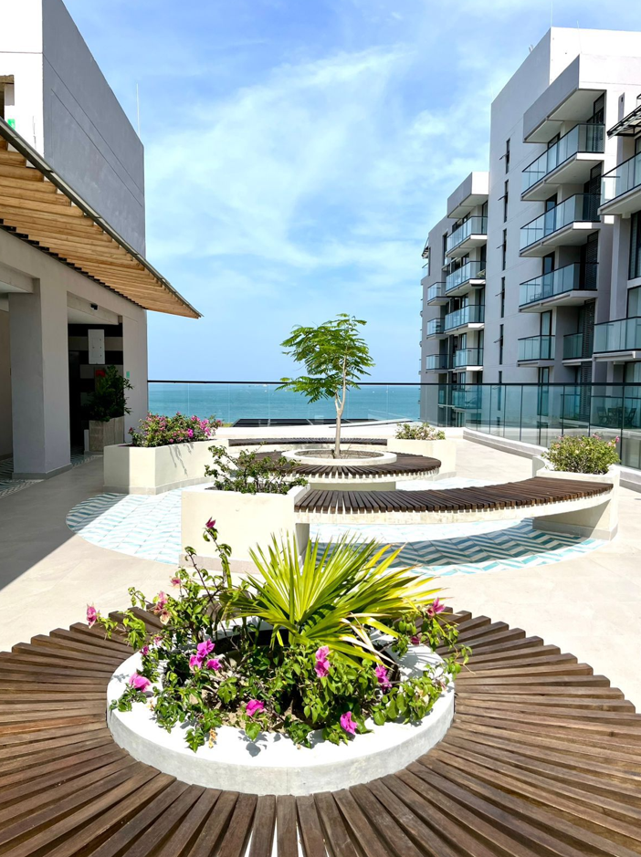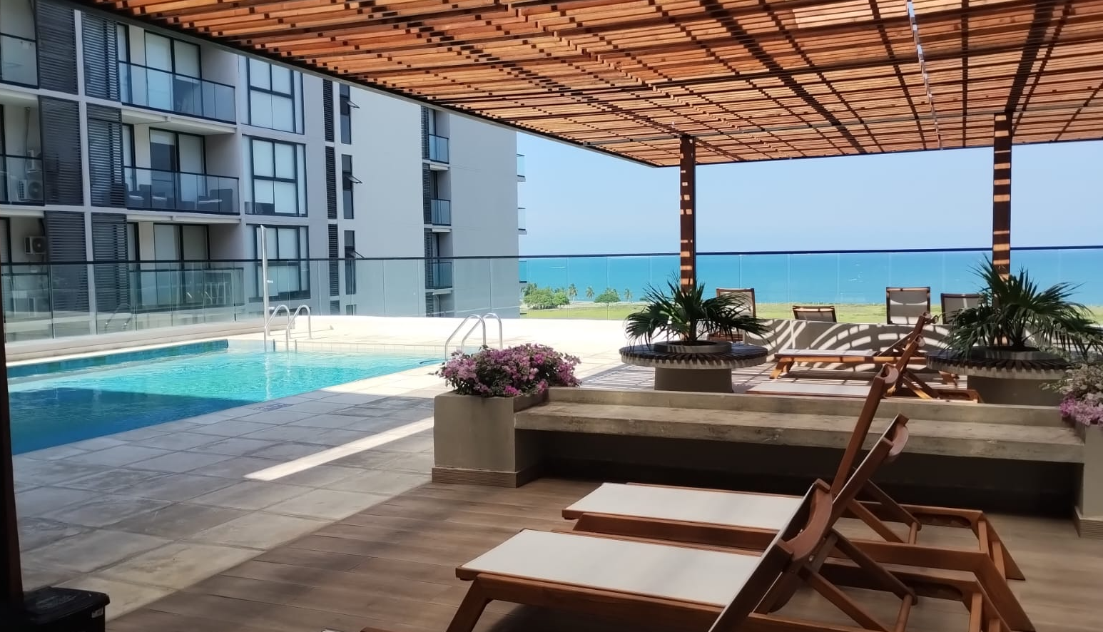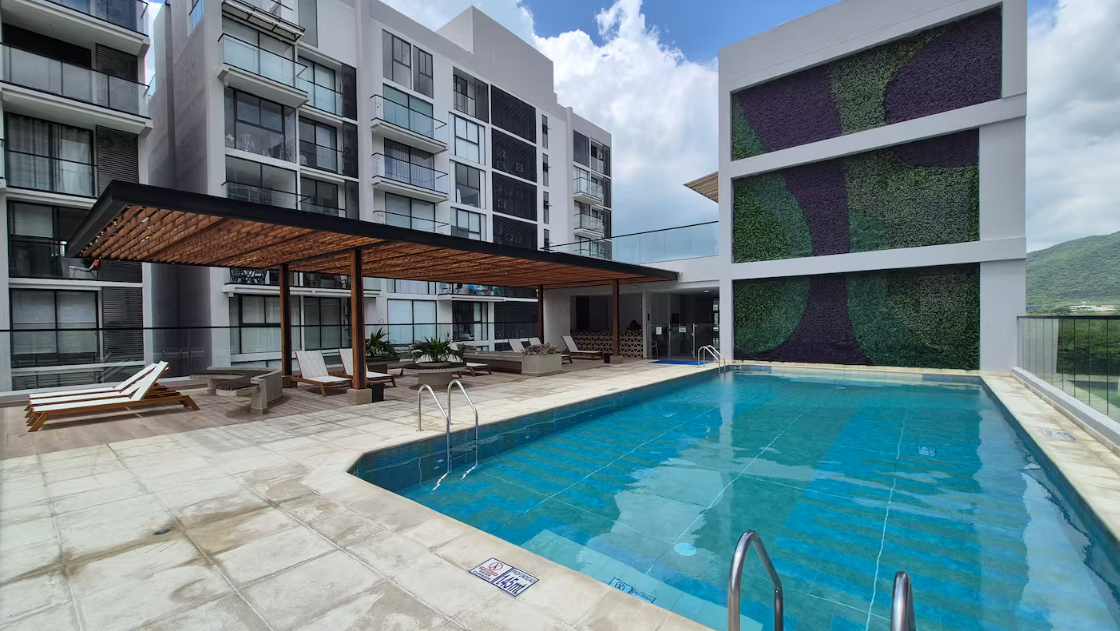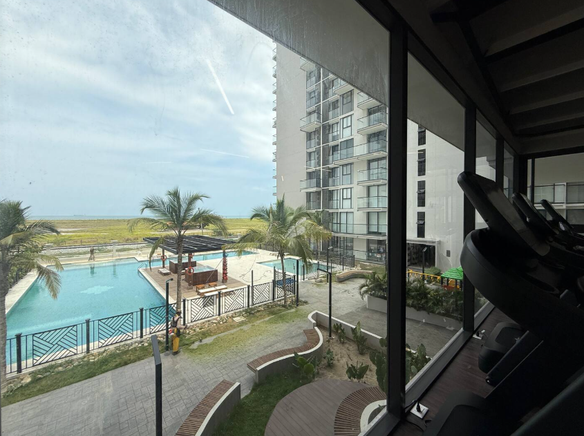 Balcón con vistas al mar y a las montañas, piscina con zona cubierta y piscina al aire libre. Gimnasio, turco y sauna, salón de lectura y sala de trabajo Coworking. Incluye parqueadero privado y WiFi; con recepción las 24 horas.