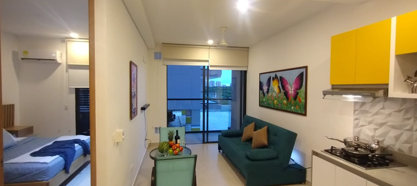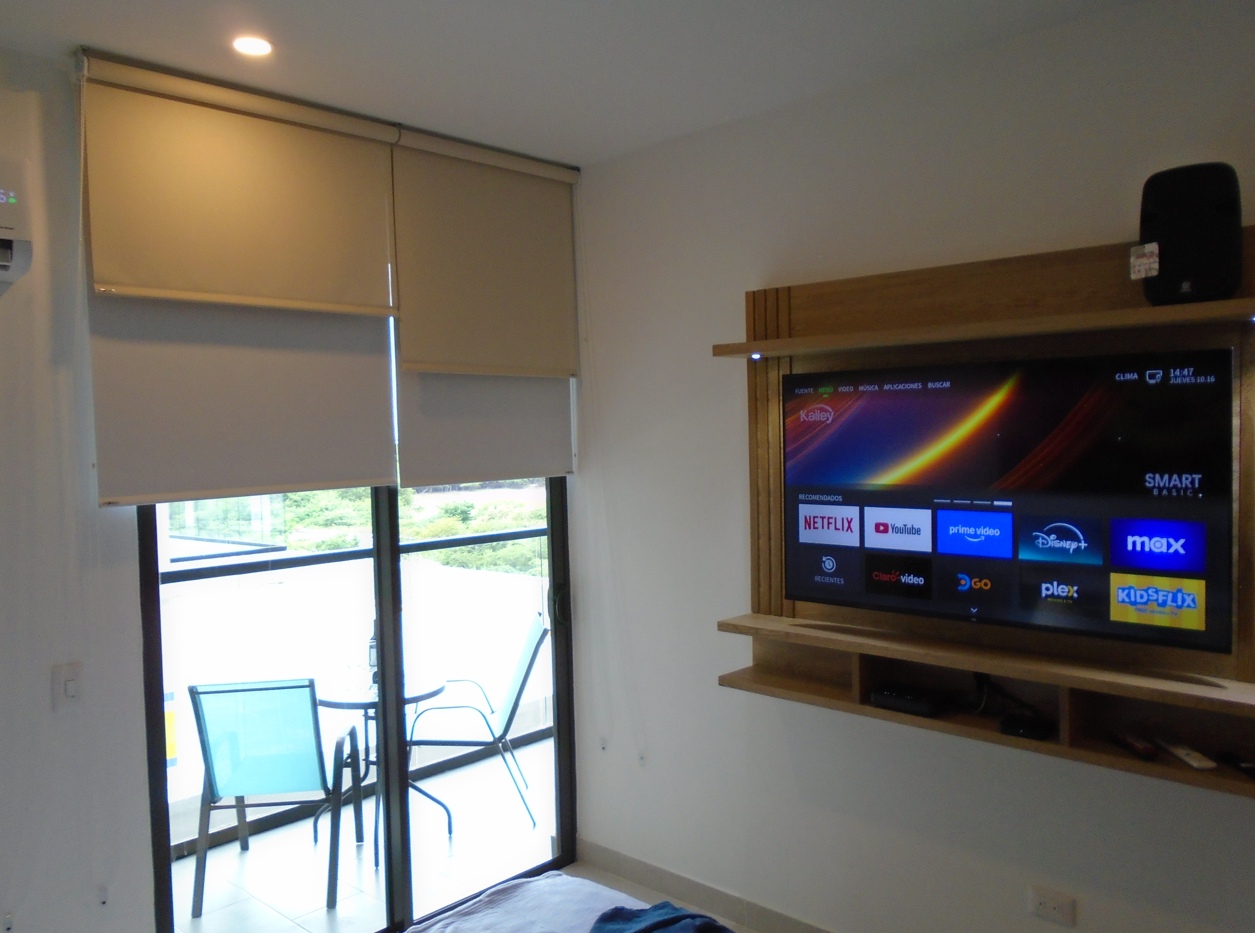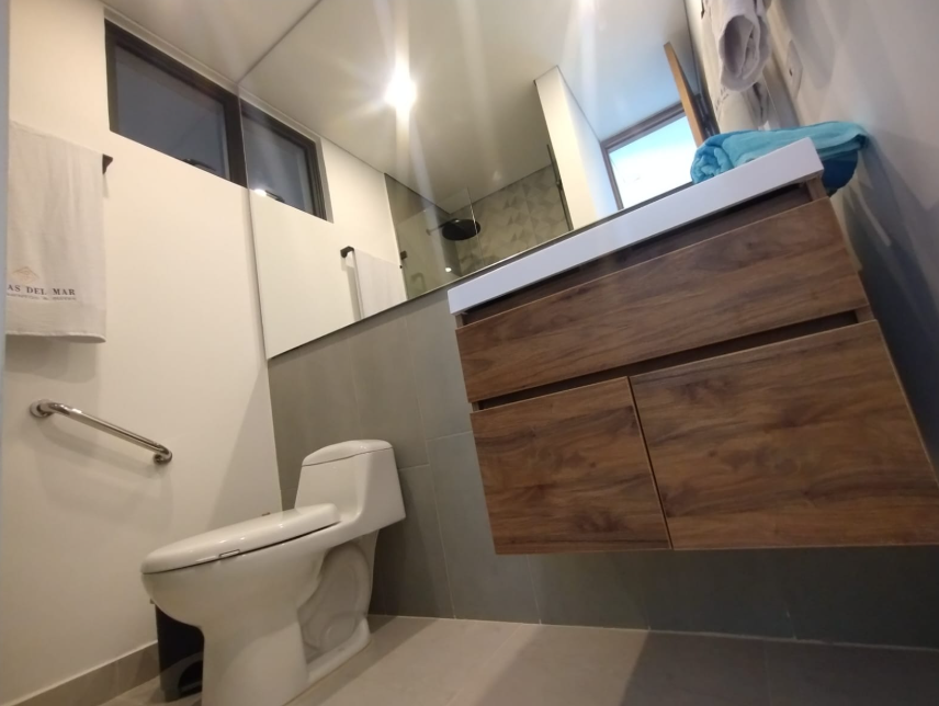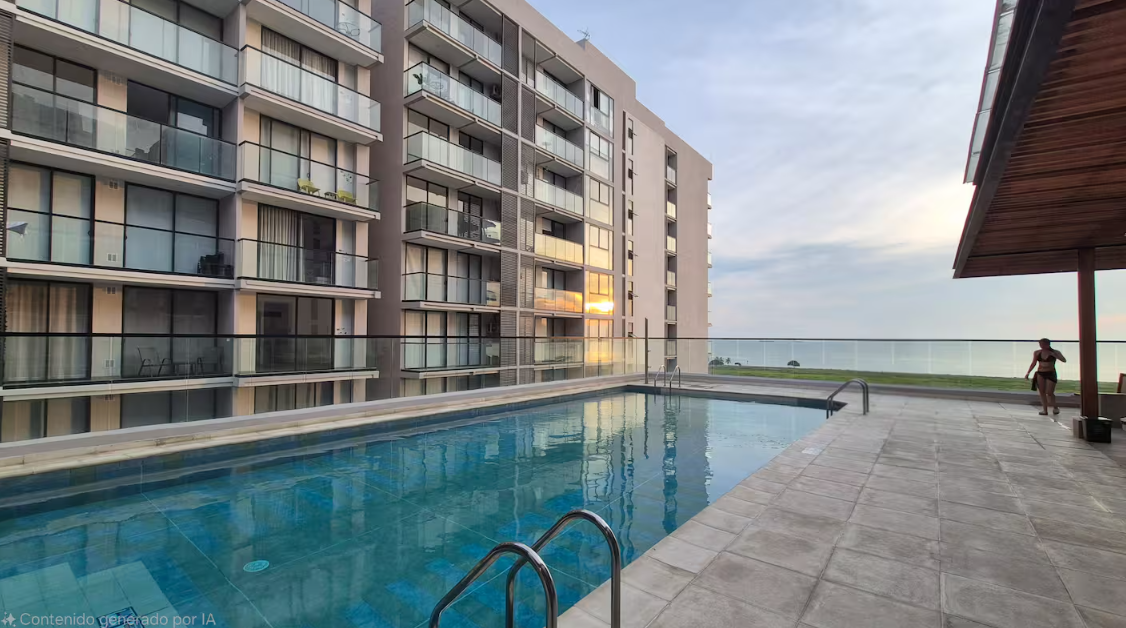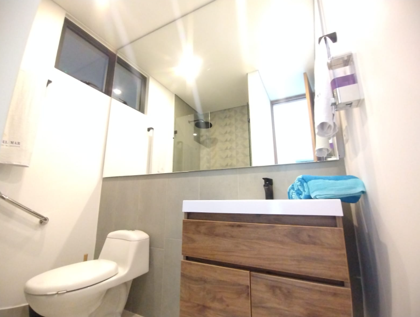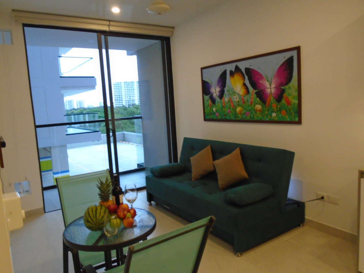 Balcón con vistas al mar y a las montañas, piscina con zona cubierta y piscina al aire libre. Gimnasio, turco y sauna, salón de lectura y sala de trabajo Coworking. Incluye parqueadero privado y WiFi; con recepción las 24 horas.