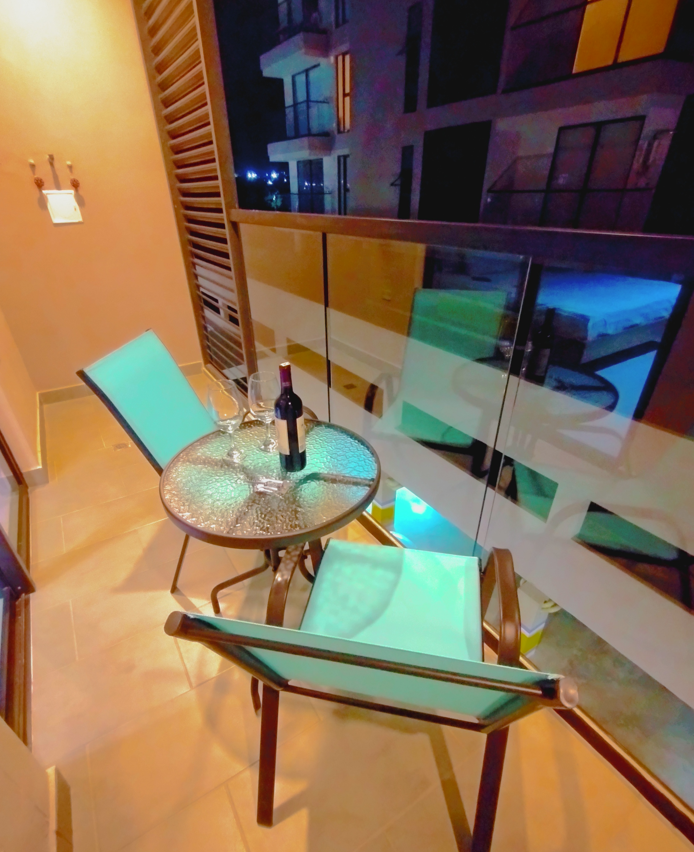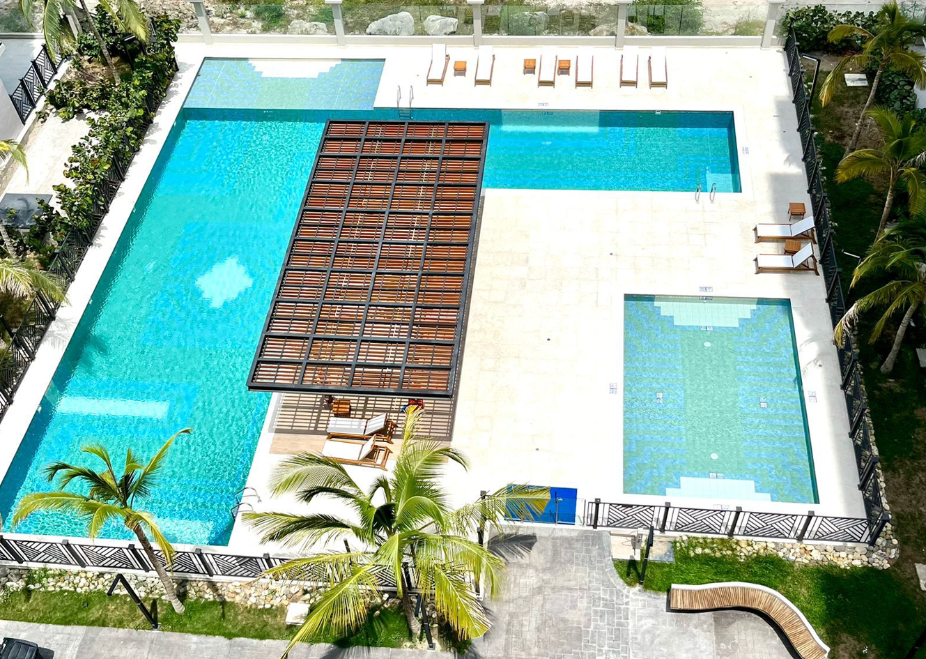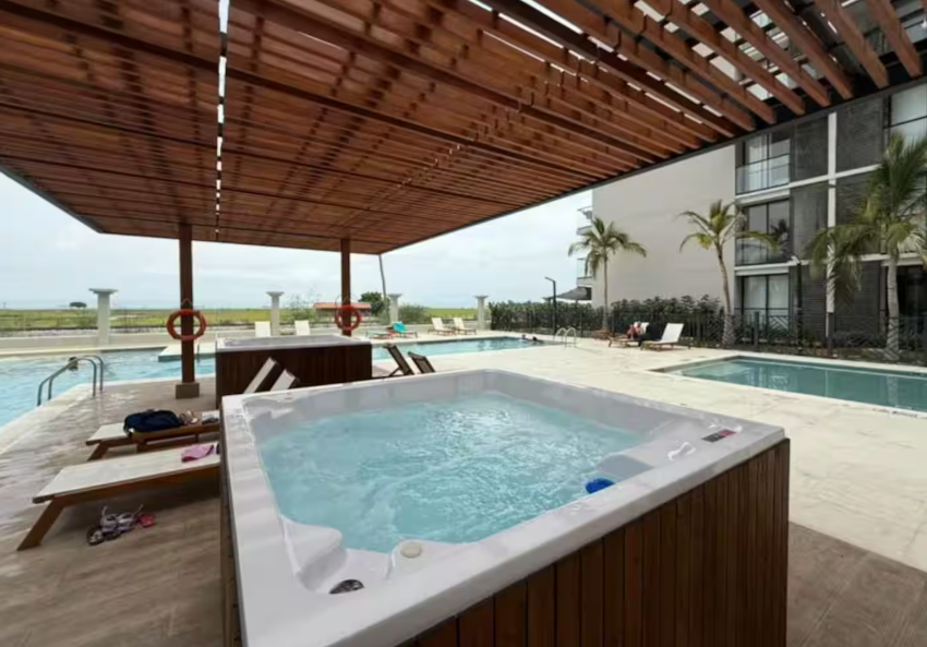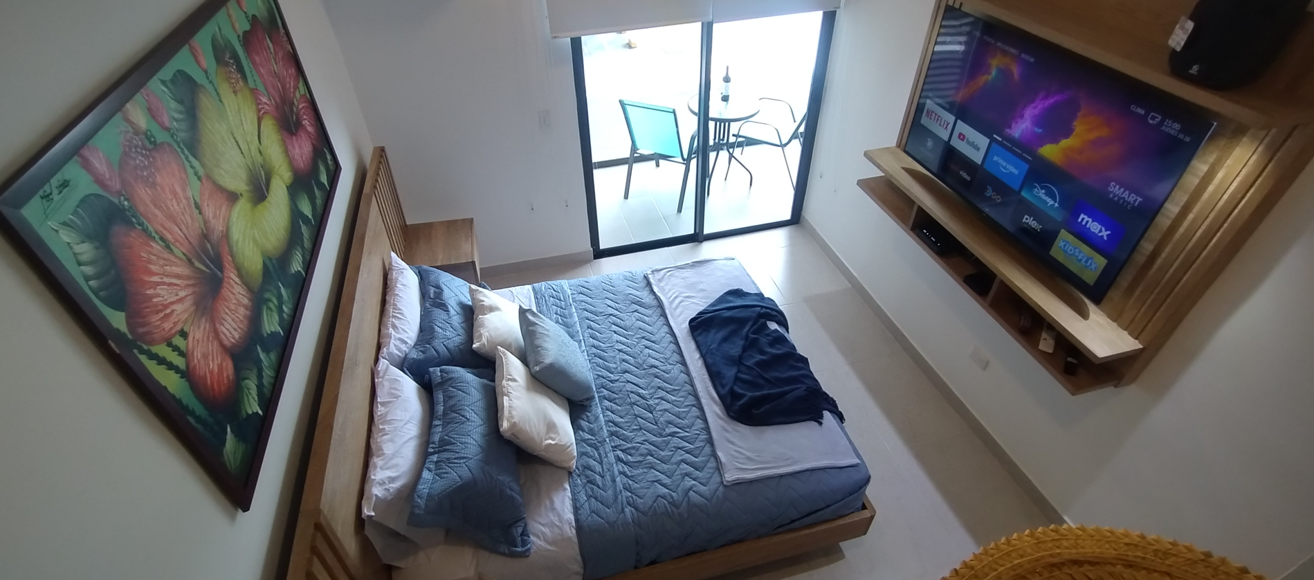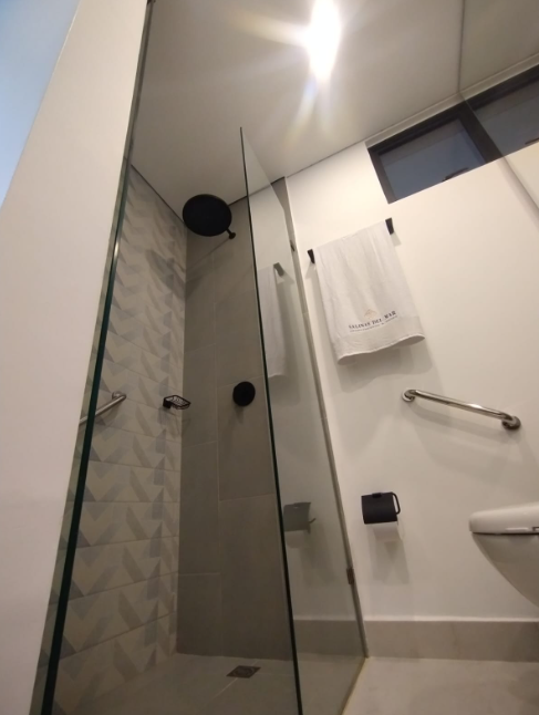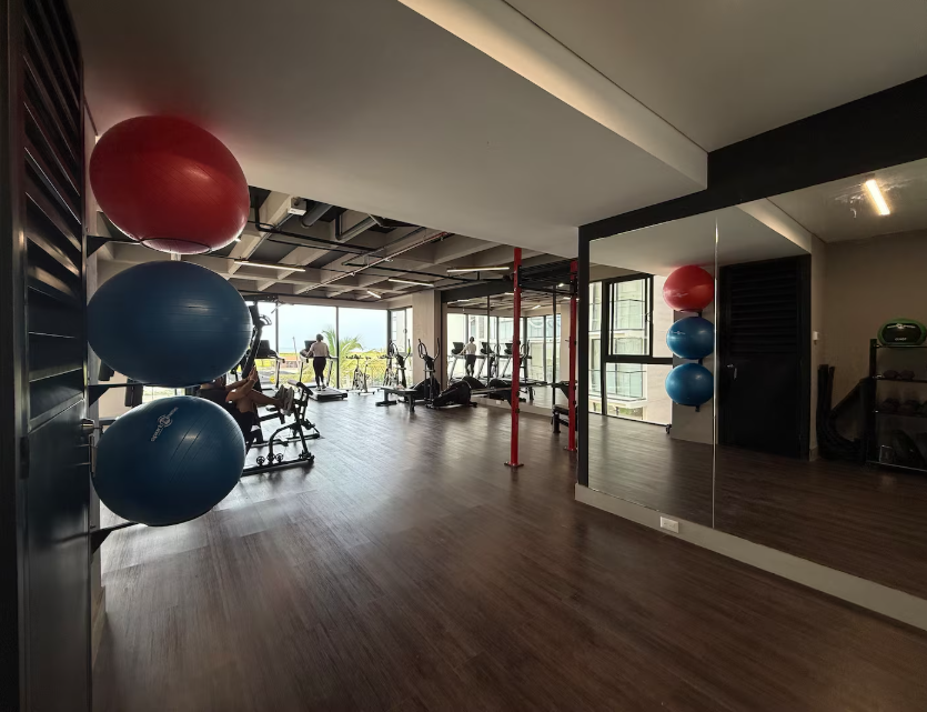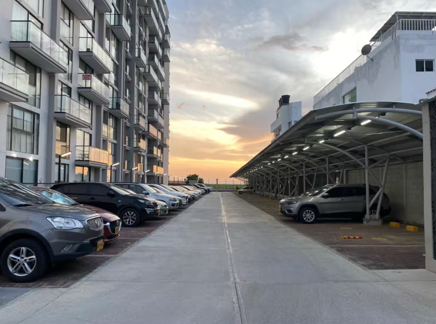 Balcón con vistas al mar y a las montañas, piscina con zona cubierta y piscina al aire libre. Gimnasio, turco y sauna, salón de lectura y sala de trabajo Coworking. Incluye parqueadero privado y WiFi; con recepción las 24 horas.