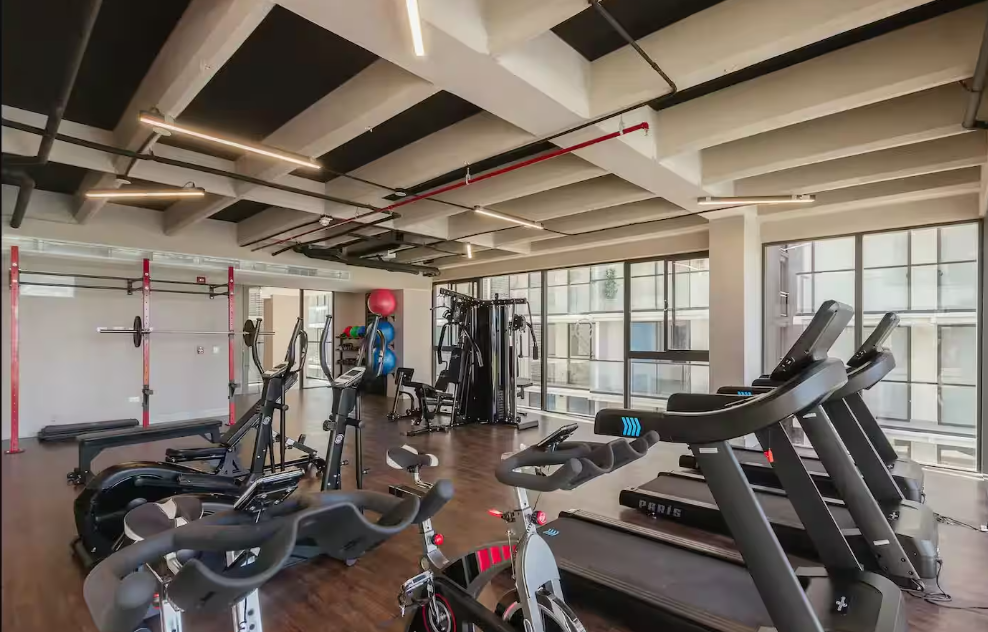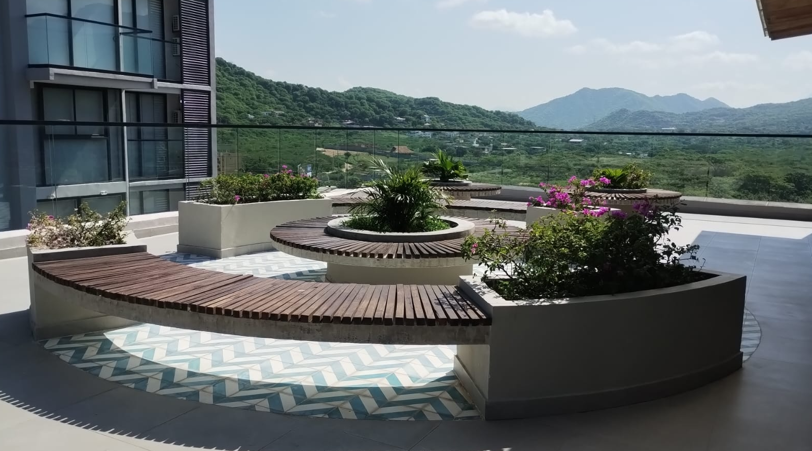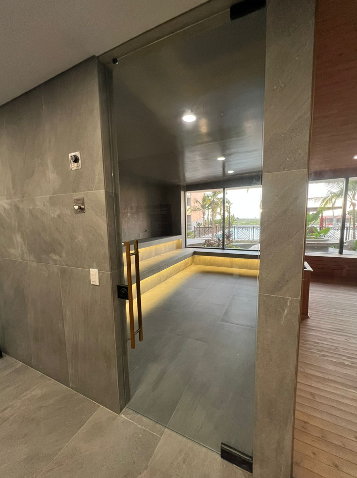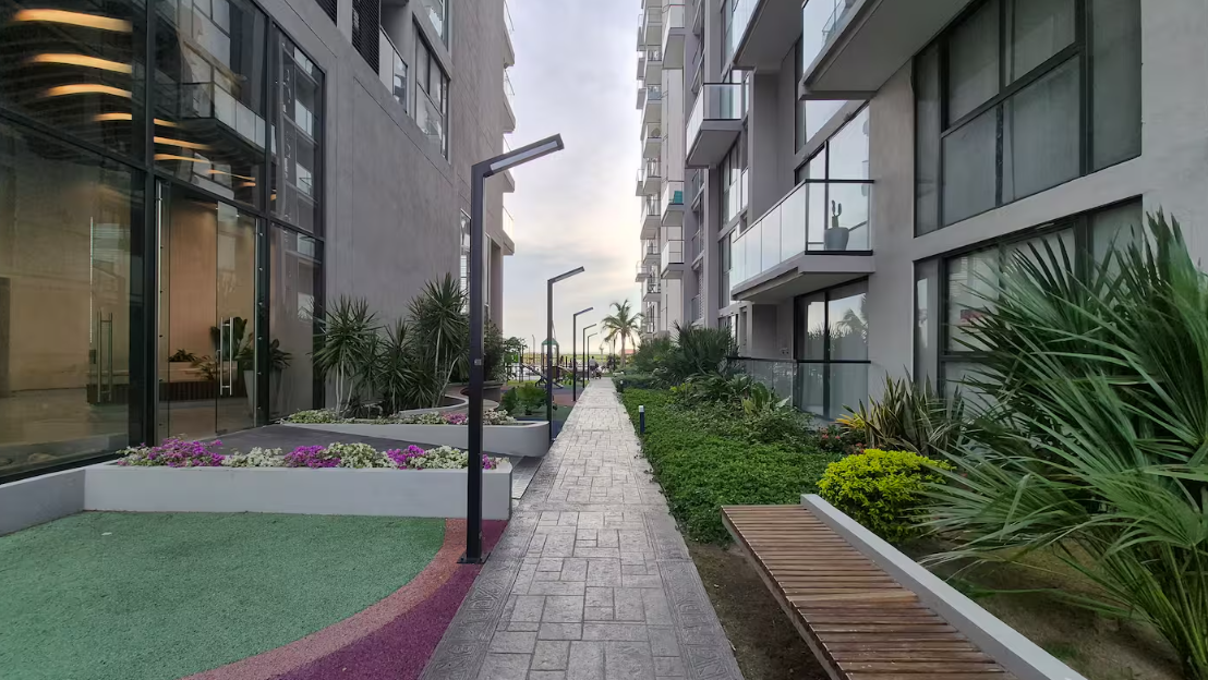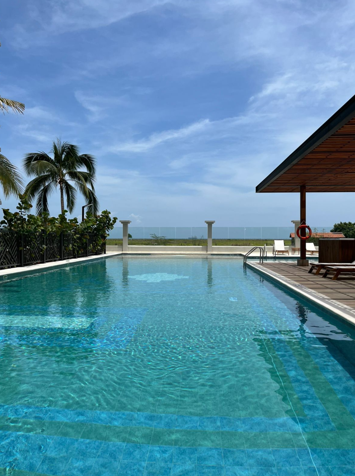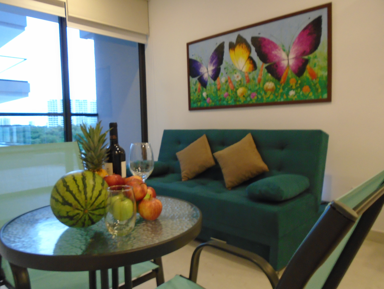 Balcón con vistas al mar y a las montañas, piscina con zona cubierta y piscina al aire libre. Gimnasio, turco y sauna, salón de lectura y sala de trabajo Coworking. Incluye parqueadero privado y WiFi; con recepción las 24 horas.